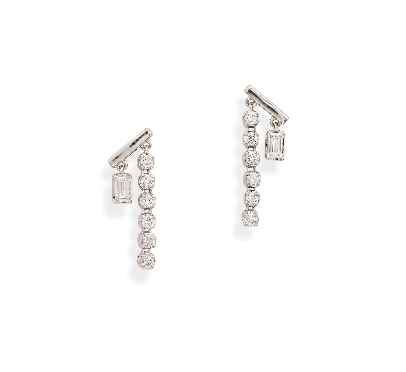 バケットカットのダイヤ一石と、メレダイヤの連なりのアシンメトリーなデザイン。